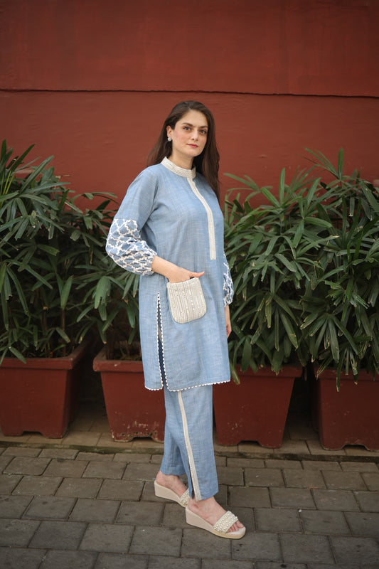 Beige Kurta with Blue Embroidery and Cutwork Slits, Paired with Straight Pants