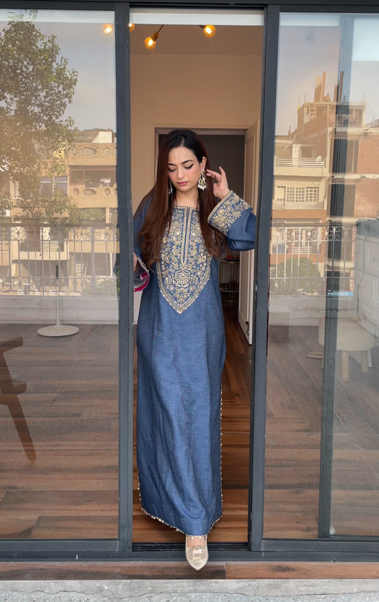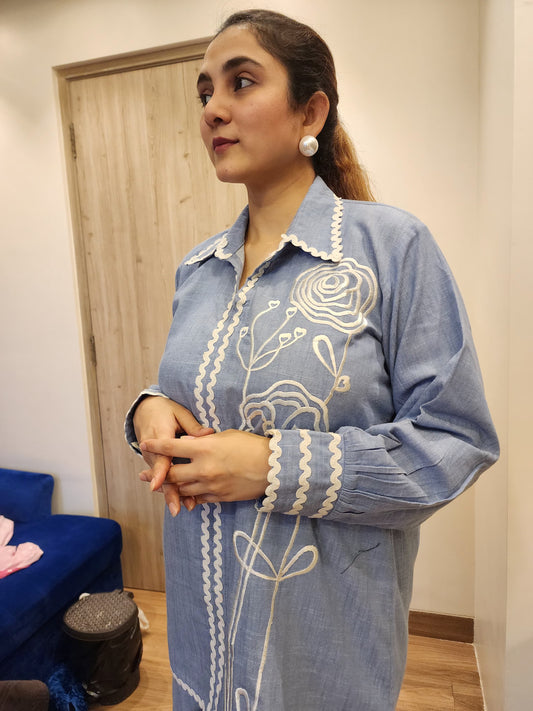 Blue Soft Denim Long Kurti and Pants with Resham Work
