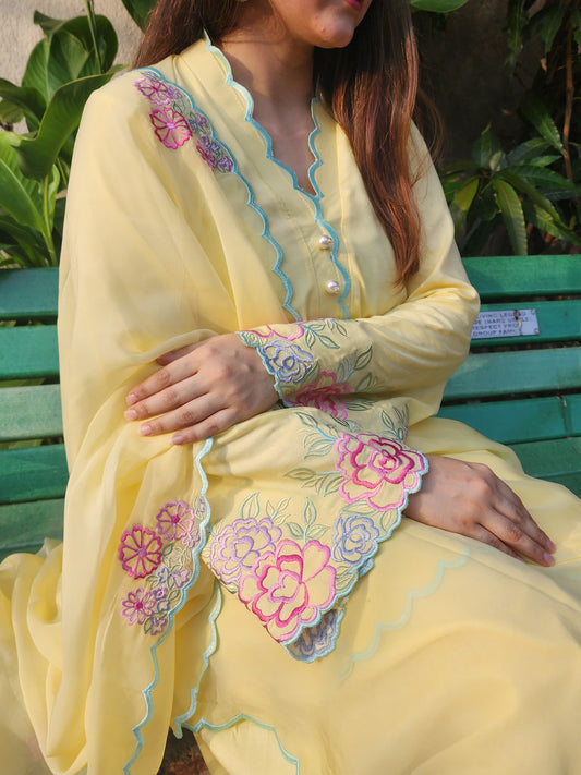 Long kurta with flair pants and organza silk dupatta