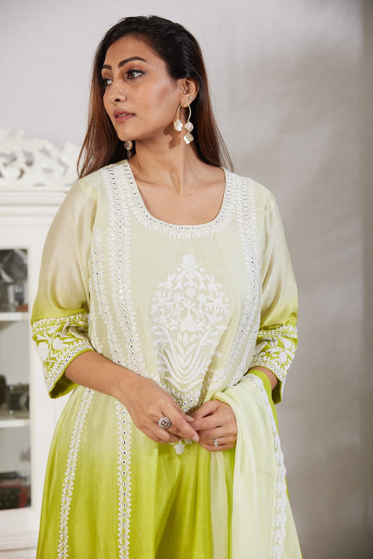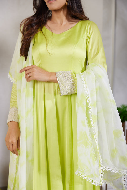 Long kaliwala anarkali with plazza pants ,dupattah organza silk with tie and dye effects finish with dori work borders