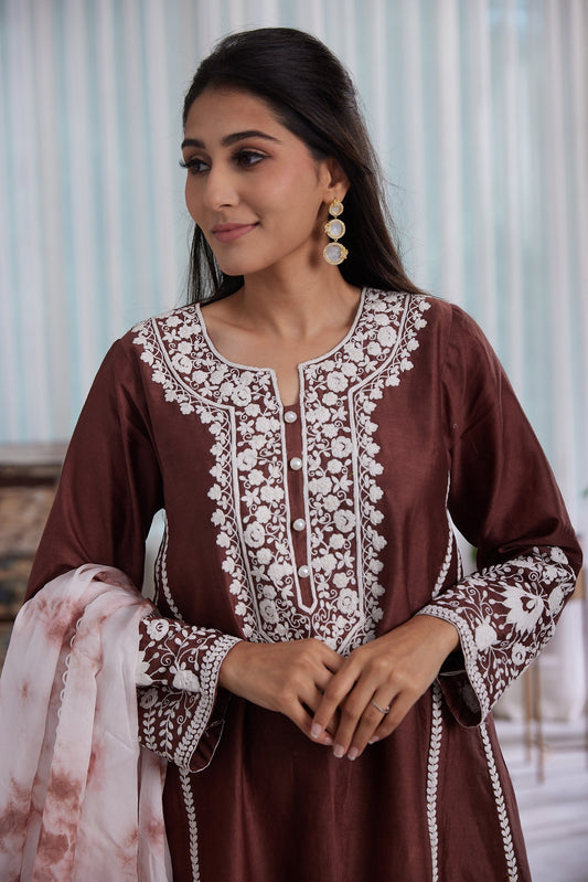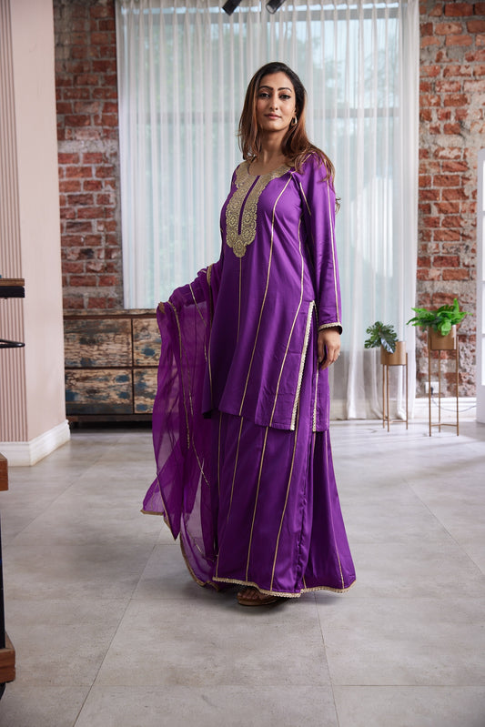 Kurta with gold neckline work along with kaliwala pants with gotta work ,dupattah organza silk with gotta work