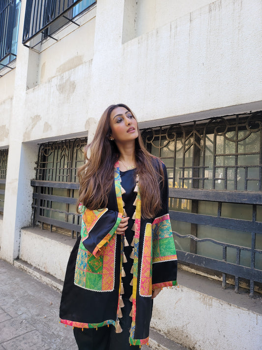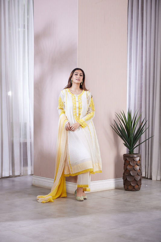 Kalidar kurta with pockets and dori work along with straight pants and tie and dye dupattah