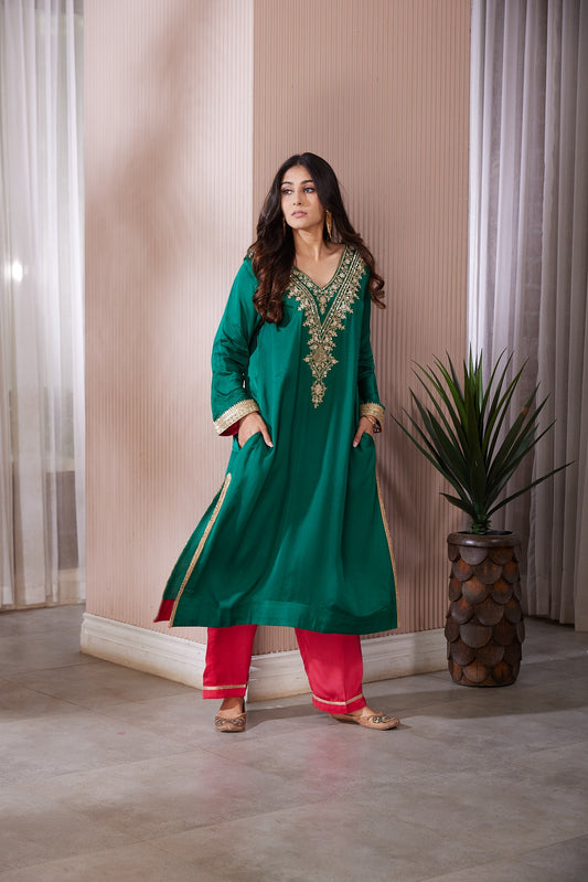 Long kurta with pockets Neckline with pure Zardosi handwork