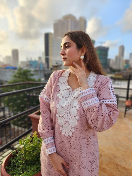 Long kurta with high neck cut work in the neck and sleeves straight pants with cuts on the side