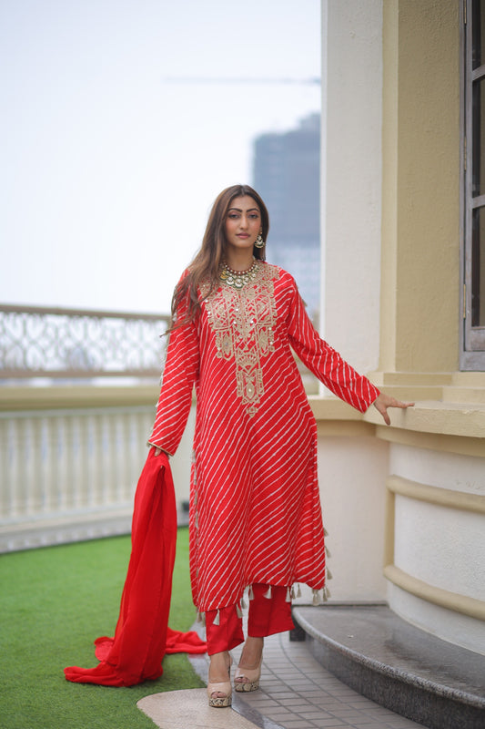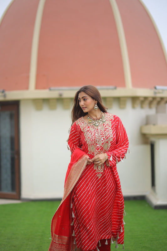 Kalidar kurta with pockets and dori work along with straight pants and tie and dye dupattah