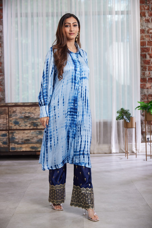Straight kurta with mirror work along with straight pants and tie and dye dupattah