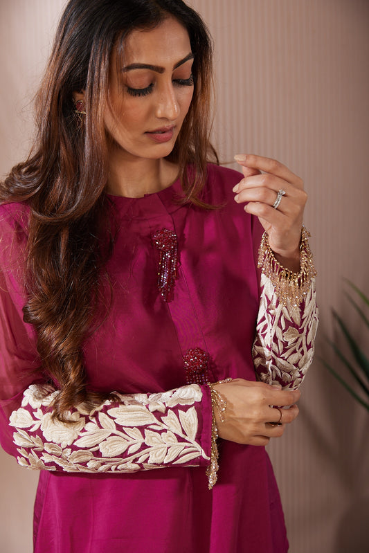 Long skirt with elegant drapes with a short kurti sleeves fully Resham worked with crystal hangings