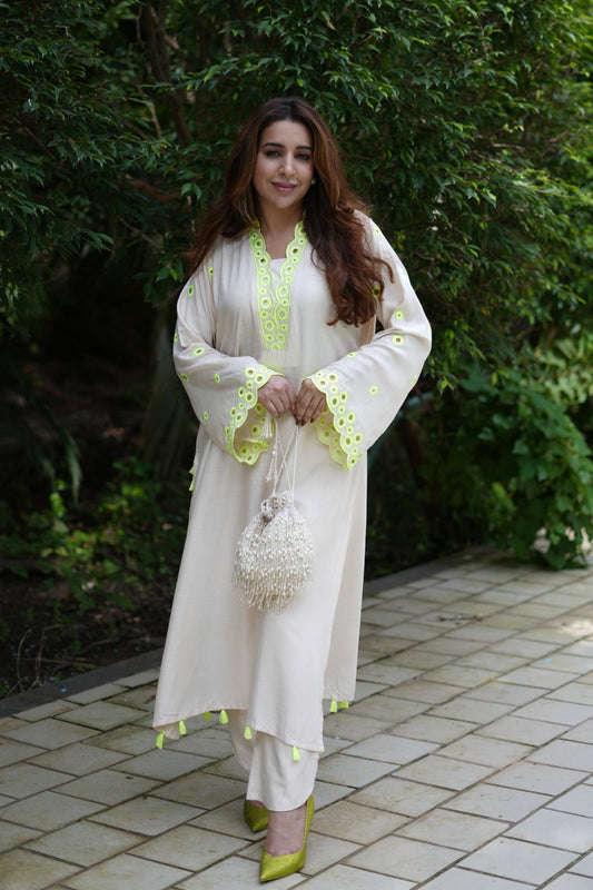 Beige Kurta with Blue Embroidery and Cutwork Slits, Paired with Straight Pants
