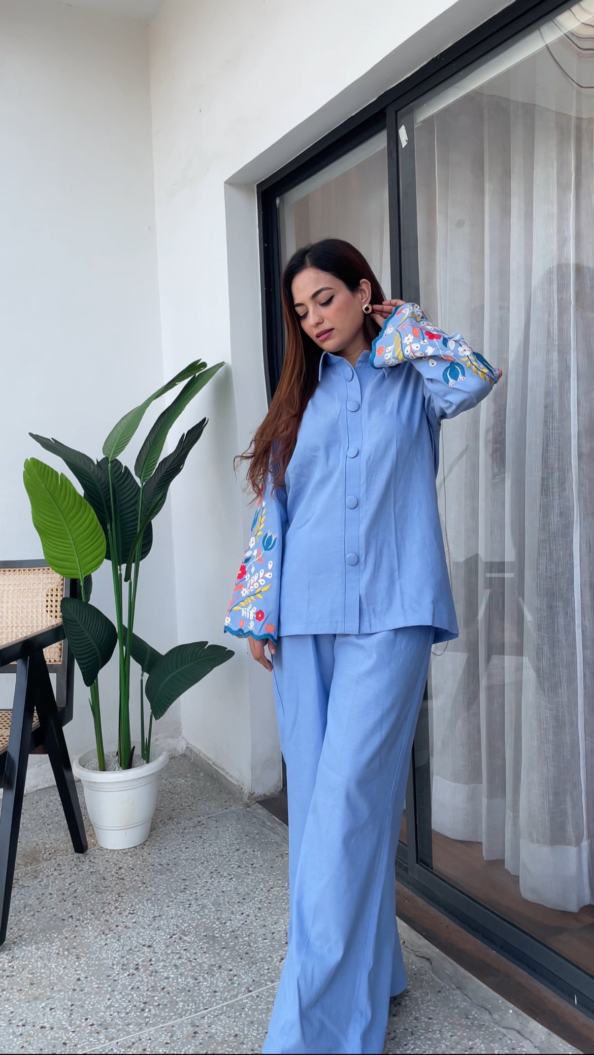 Cotton Denim Shirt with Embroidery and Bell Bottoms