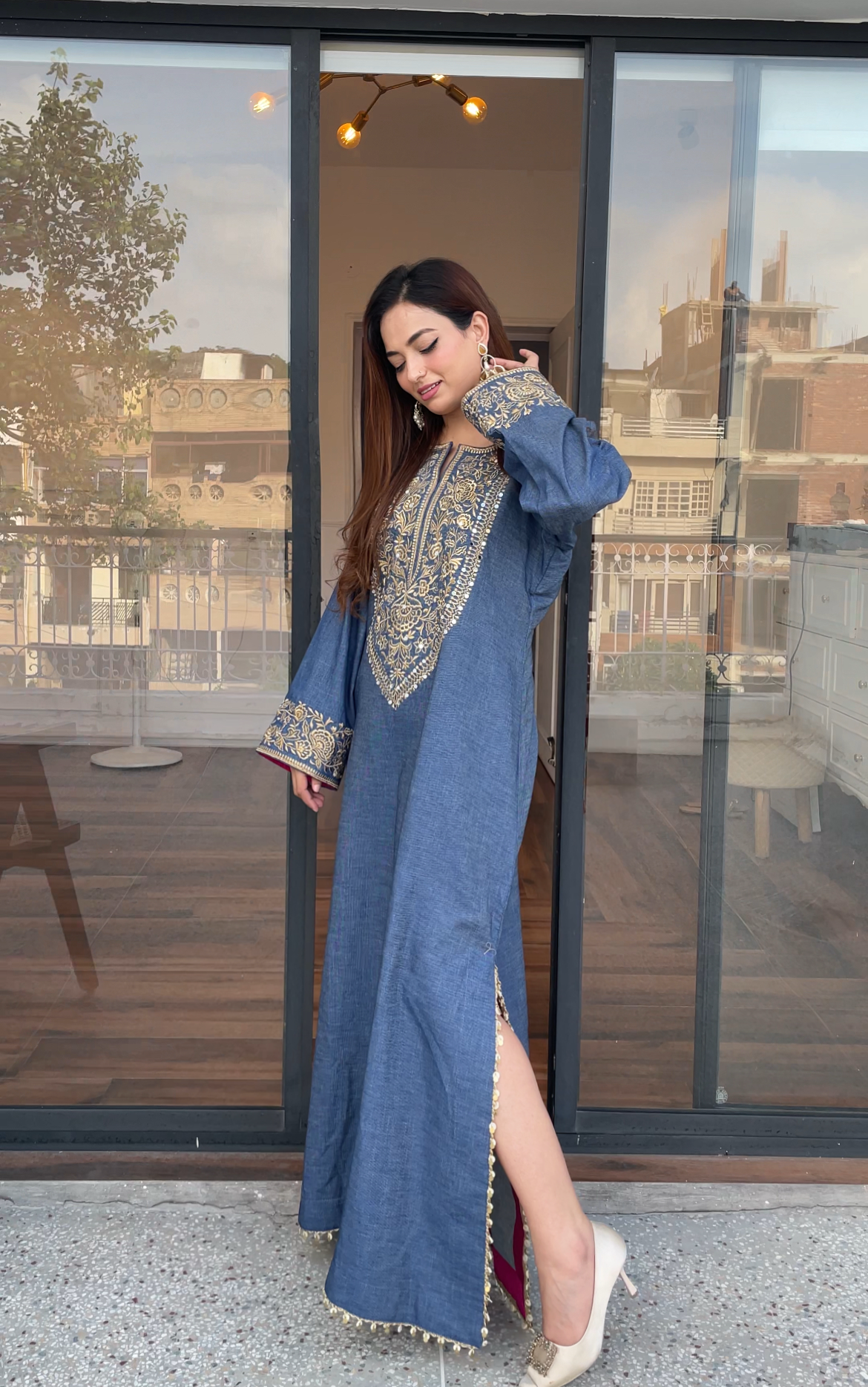 • Work: kasab and mirror embroidery with sequence and beads detailing in the slits and Daman