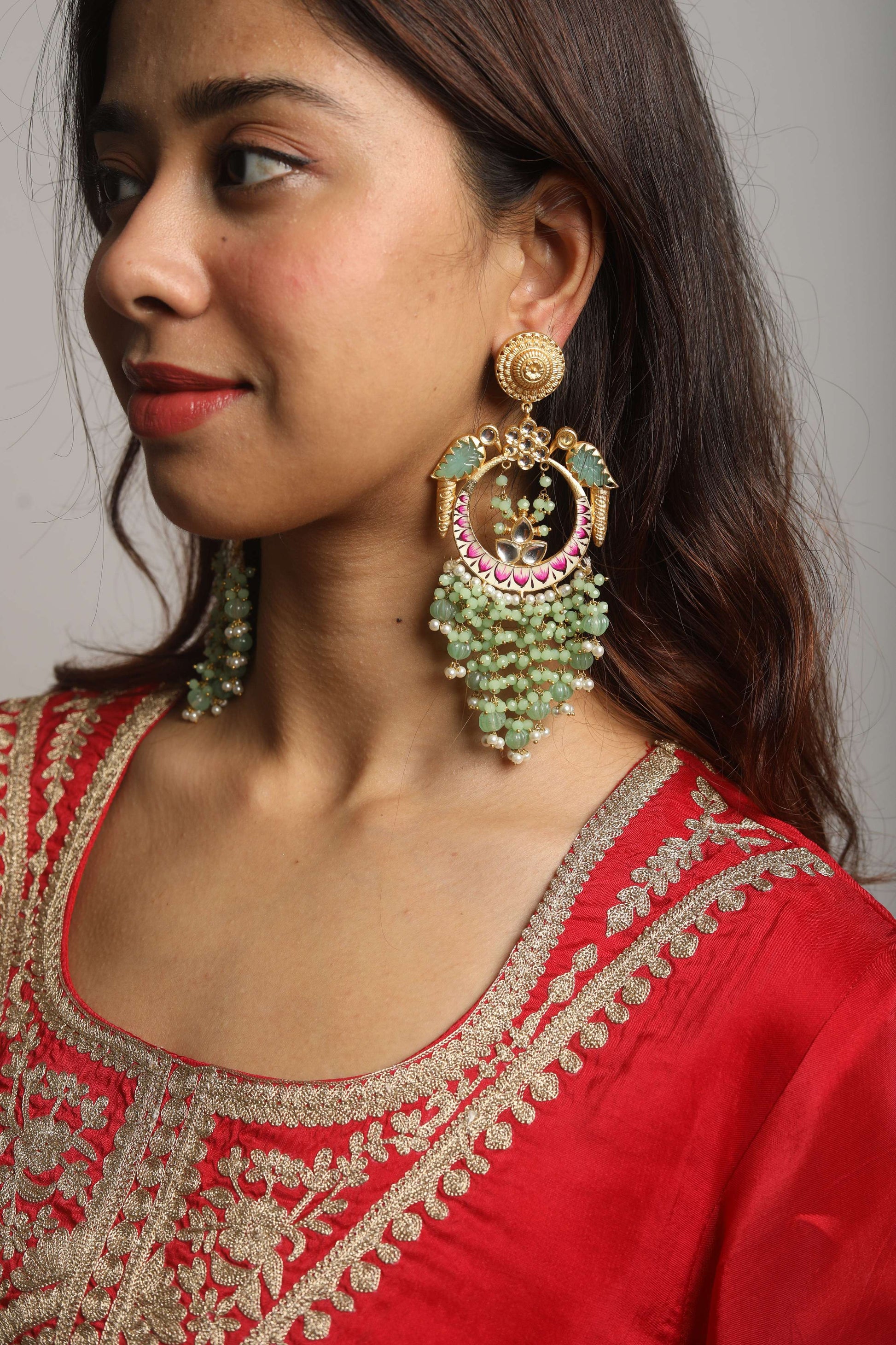 Light Green Meenakari Beads Earrings Brass Chandbali Earring