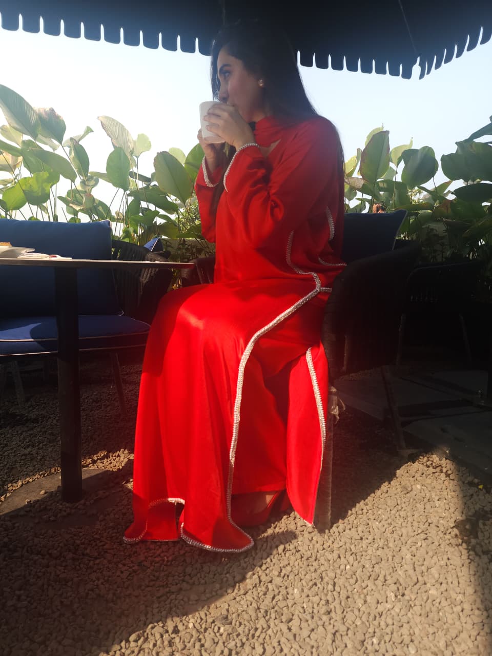 Red Silk Straight Kurti Set with Silver Crystal Stone Work & Dupatta