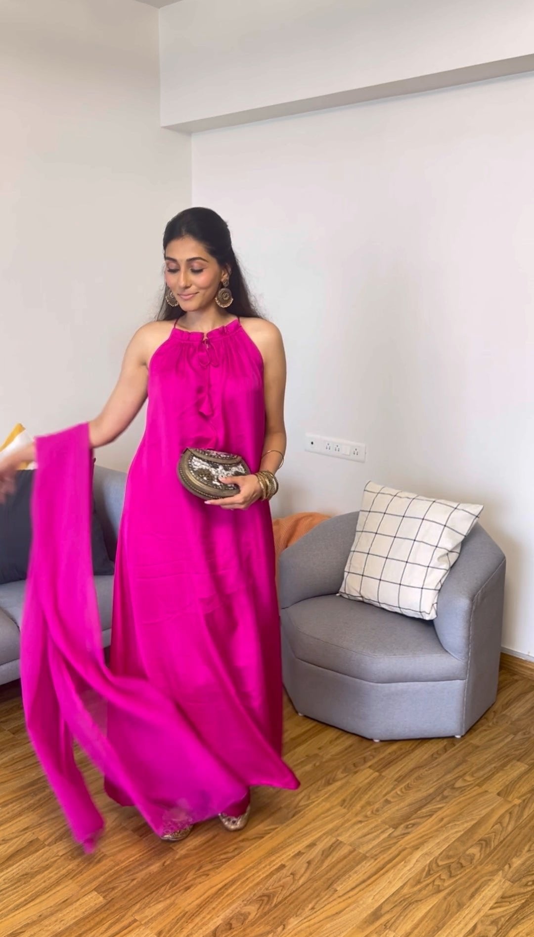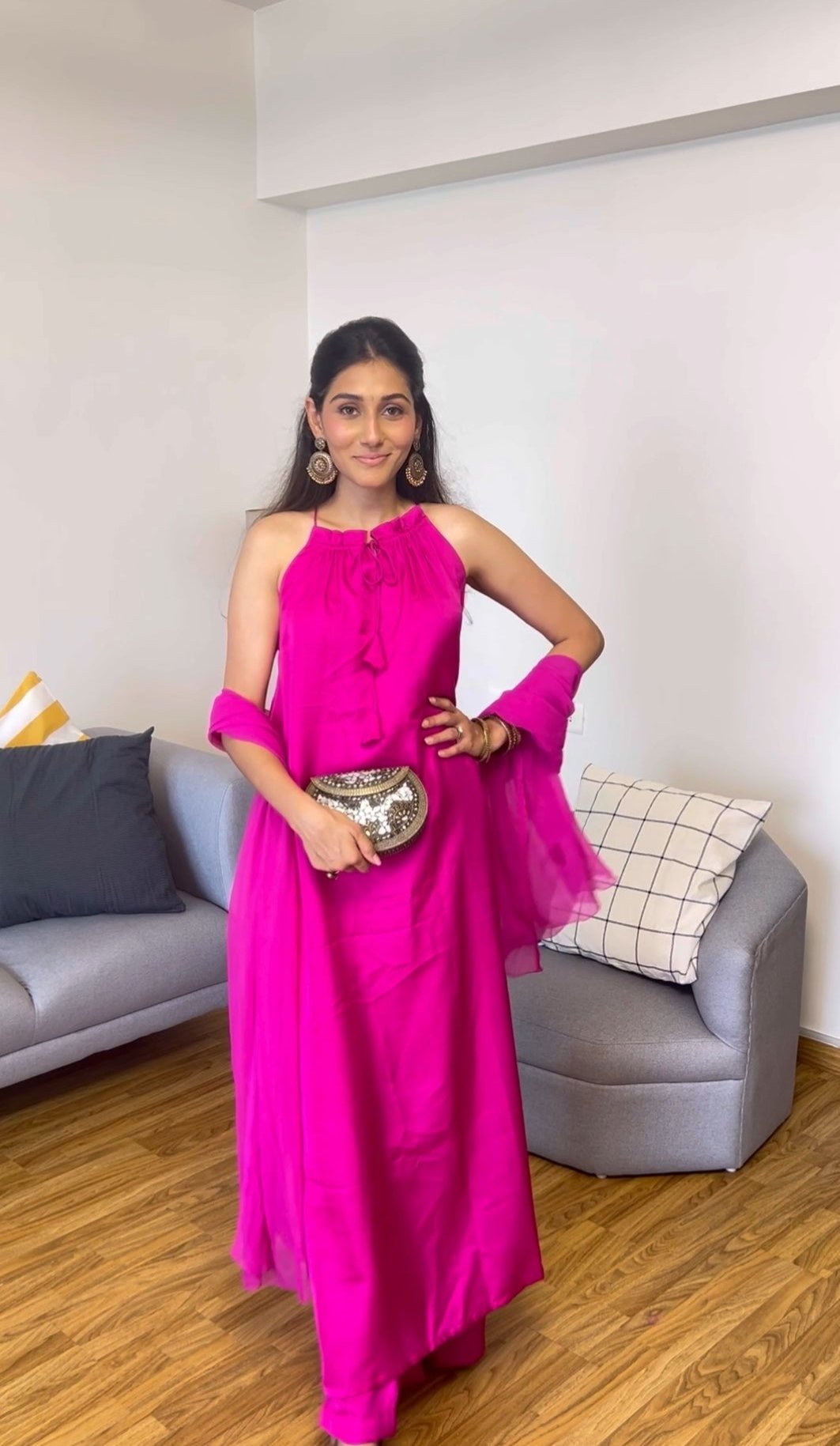 • Style- The outfit is made in soft silk along with organza dupatta, It's a long sleeveless top with gathers on the neck With loose straight pant.