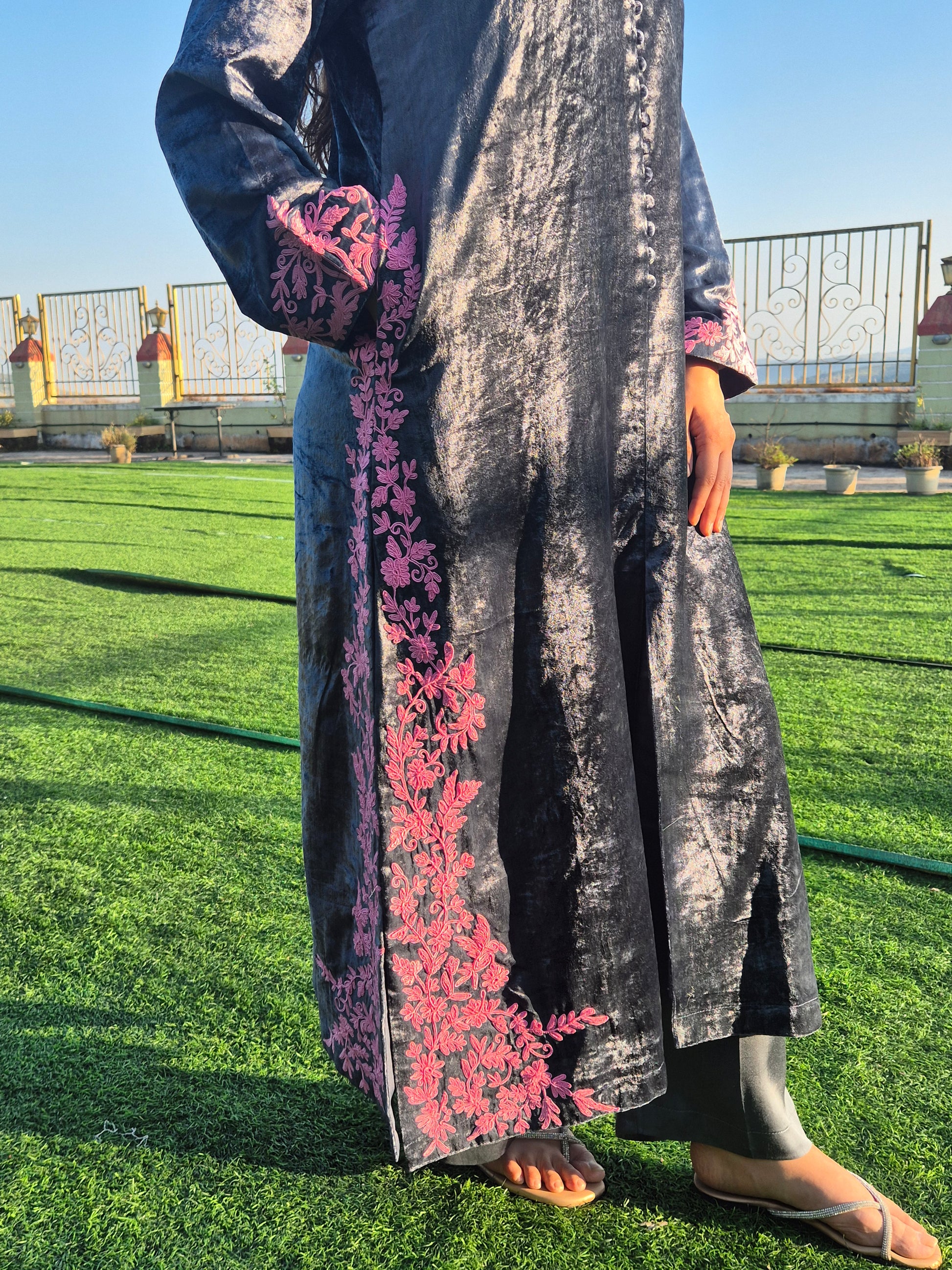 Velvet Silk Long Kurta Set with Dori Detailing on Slits and Pocket
