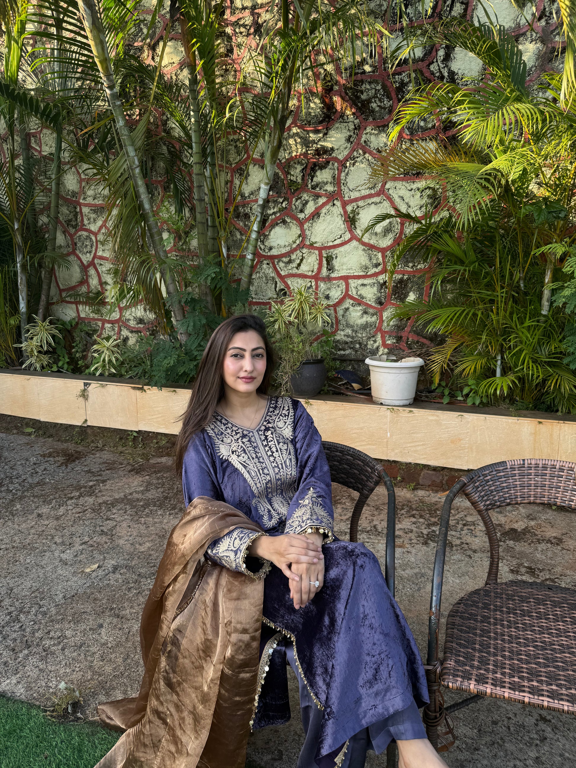 Velvet Silk Long Kurta with Straight Pants in Purple & Bronze with Aari Detailing”