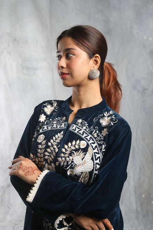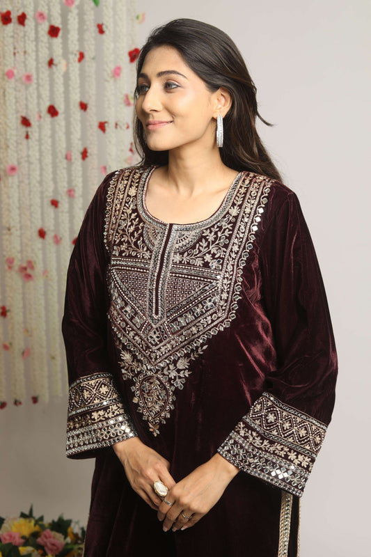 Velvet Silk Long Kurta with Straight Pants in Purple & Bronze with Aari Detailing”